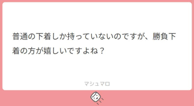 他にも気になる事や知りたい事があればお気軽にマシュマロください。【質問】普通の下着しか持っていないのですが、勝負下着の方が嬉しいですよね?
