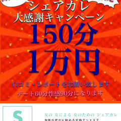 いつもの感謝を込めて 150分10,000円イベントを開催します (シンデレラランク限定) 内容は60分サービスデート+90分性感マッサージの合計150分を10,000円。 何度でもご利用いただけます♪ 二回目は130分、三回目以降は120分になります♪ セラピストランクが上がってしまう前に お気に入りのセラピストを見つけてくださいね サービス料は無料になりますが ホテル代や飲食代はお客様負担になります。 交通費は別途必要になります。 フリーセラピストの場合は指定できませんし、 セラピストを事前にお伝えできません。 セラピストを指定する場合は新人セラピスト又は シンデレラクラス以下のセラピストをご指名ください。 (指名料2000円) セラピストの出勤状況はこちらからご覧ください。 https://www.purelovers.com/kanto/shop/14140/schedule/ ●ご新規様、ご利用客様、いずれの方もご応募頂けます♪ ただし、セラピスト毎に初回限定になります。 同じセラピストや過去にご利用頂きましたセラピストはお使い頂けません。 条件は以下の通りです。 1.お店と秘密保持契約を締結出来る方 2.お約束の日時を守れる方 3.指定のレポート提出と指定のサイトに口コミが書ける方 4.150分は合流してから解散までの時間とさせて頂きますのでご了承頂ける方 ●口コミ投稿及びレポートについて レポート1件 口コミ 1件以上 を施術日翌日までにお願い致します。 https://kaikan.co/user-login/ どうぞ宜しくお願い致します。 ●キャンセルは原則不可になりますが、 感染症などの場合はご相談くださいませ。 女の女による女のための美容性感マッサージ シェアカレ 東京・大阪 営業時間 24時間営業(予約受付時間 11時~23時) 定休日 年中無休 店舗HP:https://www.sharekare.site/ 出勤情報:https://www.sharekare.site/schedule/ LINE予約:https://works.do/R/ti/p/sharekare@kaikan 予約フォーム:https://maroon-ex.jp/fx73638/EFYSFq お問い合わせ:https://www.sharekare.site/contact/