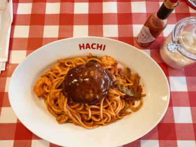 久々にハンバーグが食べたくて同僚とハンバーグの名店HACHIに行ってきました🚗 香ばしく焼き上げたハンバーグから溢れる肉汁が、、、 昔懐かしいナポリタンのソースと溶け合い …