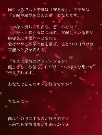 キスは愛情表現の一種だけど言葉よりも素直な気持ちが出る瞬間だと思います。