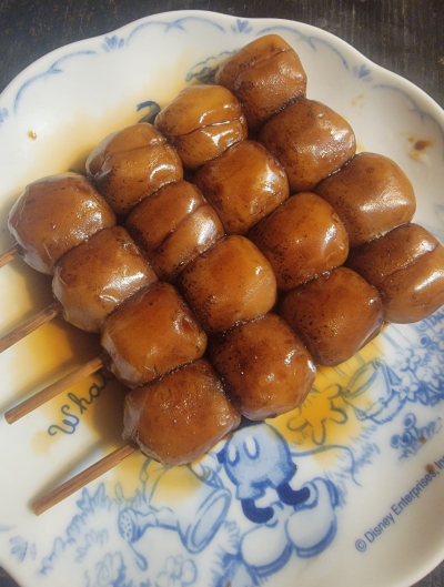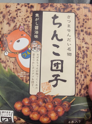 なんでも鹿児島の薩摩川内周辺では、しょうゆを塗った焼き団子の事を昔から「ちんこ団子」と呼んでいるそうです。(裏面に書いてあった)