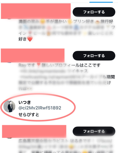萬天堂のフォローの中から【いつき】を探し出さないと