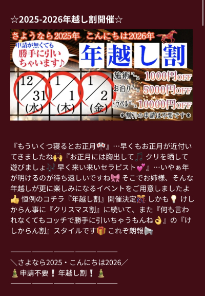 年末年始は皆さんいかがお過ごしですか? 今年も年越しイベントで割引やっちゃうみたいです! そしていつもは出勤が少ない聖奈ですがこの時期は28日〜7日まで出勤しております^_^ お時間…