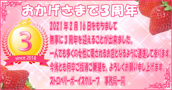 弊社ストロベリーボーイズグループは多くの皆様に支えられた結果、おかげさまで2月16日をもちまして無事に3周年を迎えることが出来ました。